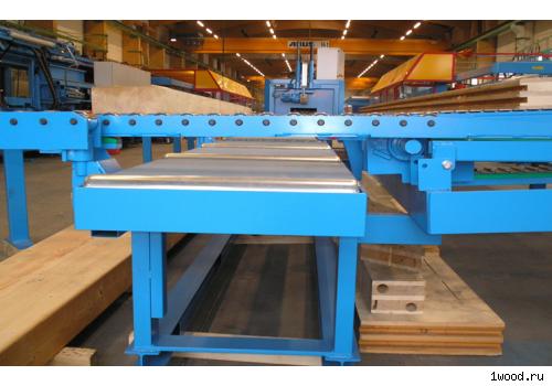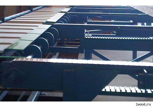 Передающий поперечный транспортер является связующим звеном между строгально-фасочным станком и обрабатывающим столярно-плотницким центром. Строительный лесоматериал выходит из обрабатывающего центра и транспортируется по поперечному транспортеру к строгально-фасочному станку. Как только строгально-фасочный станок освобождается, на него автоматически подаются детали.