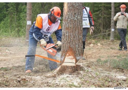 Вальщики с моторными пилами соревнуются в 2 этапа: 1 этап – валка дерева (проводится на специально подобранной делянке);