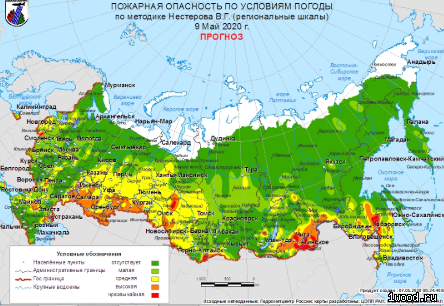 По прогнозным данным, в праздничные дни, 8, 9 и 10 мая 2020 года в 68 регионах России ожидается средний, высокий классы пожарной опасности в лесах по условиям погоды. В ряде регионов ожидается до чрезвычайного класса пожарной опасности.